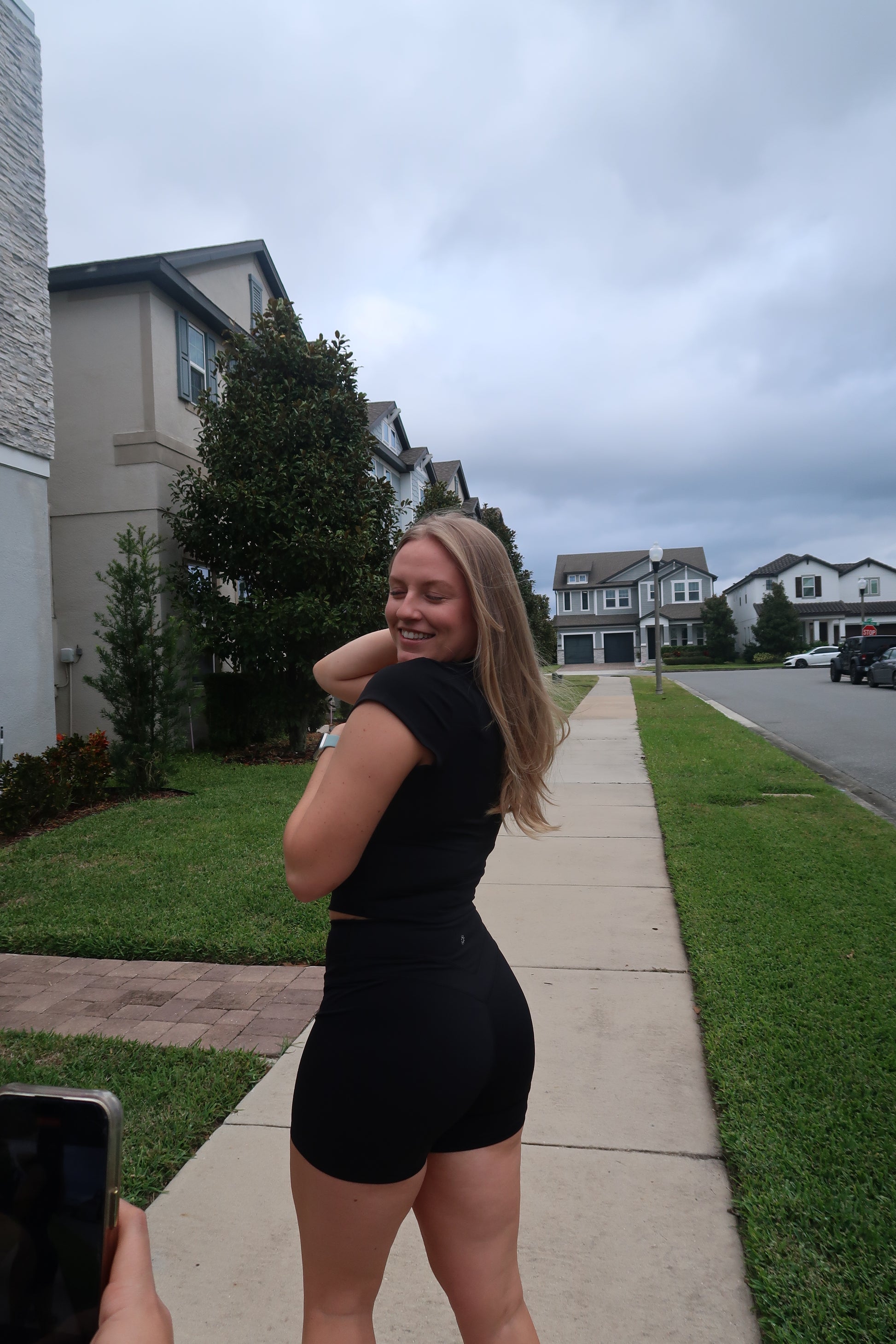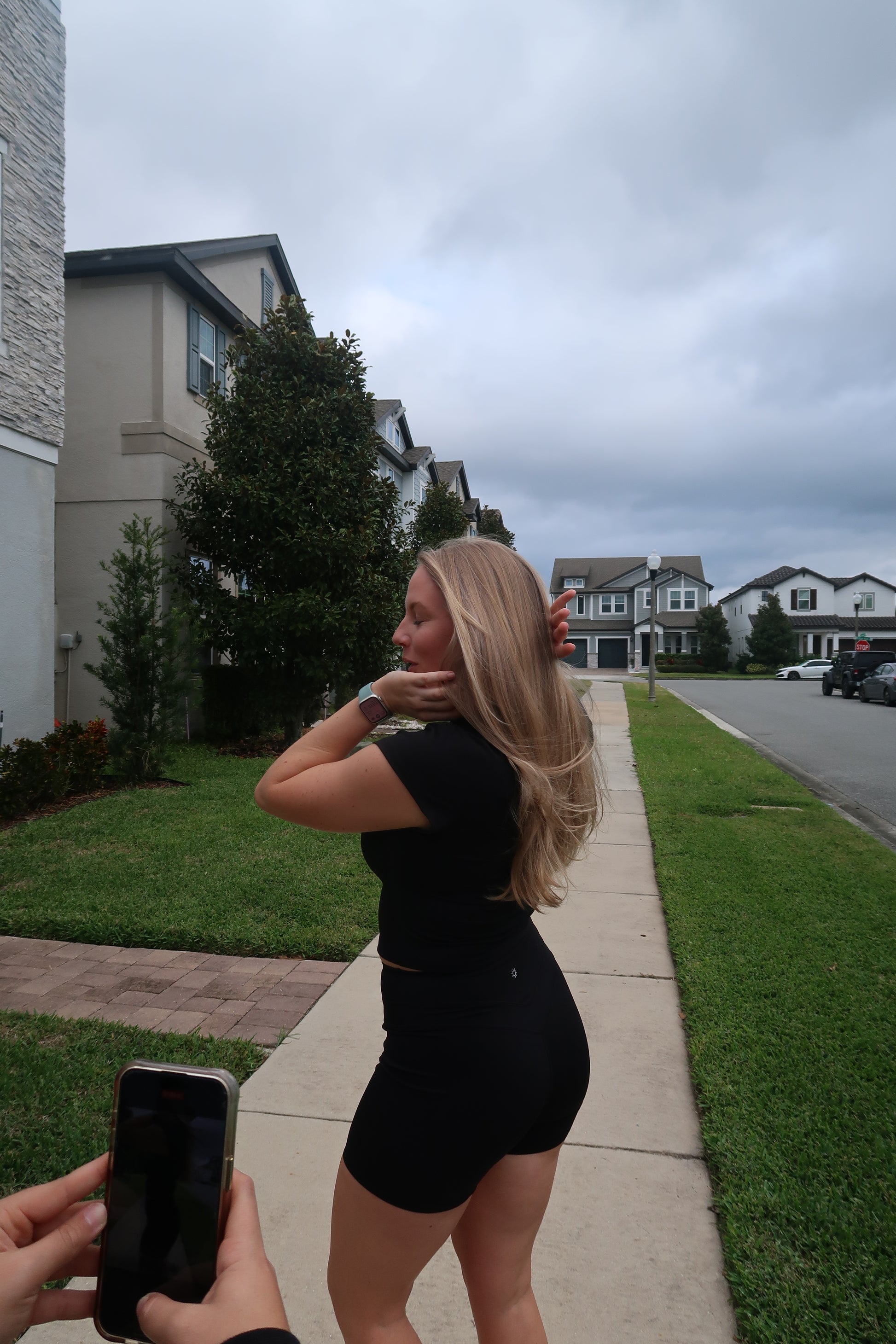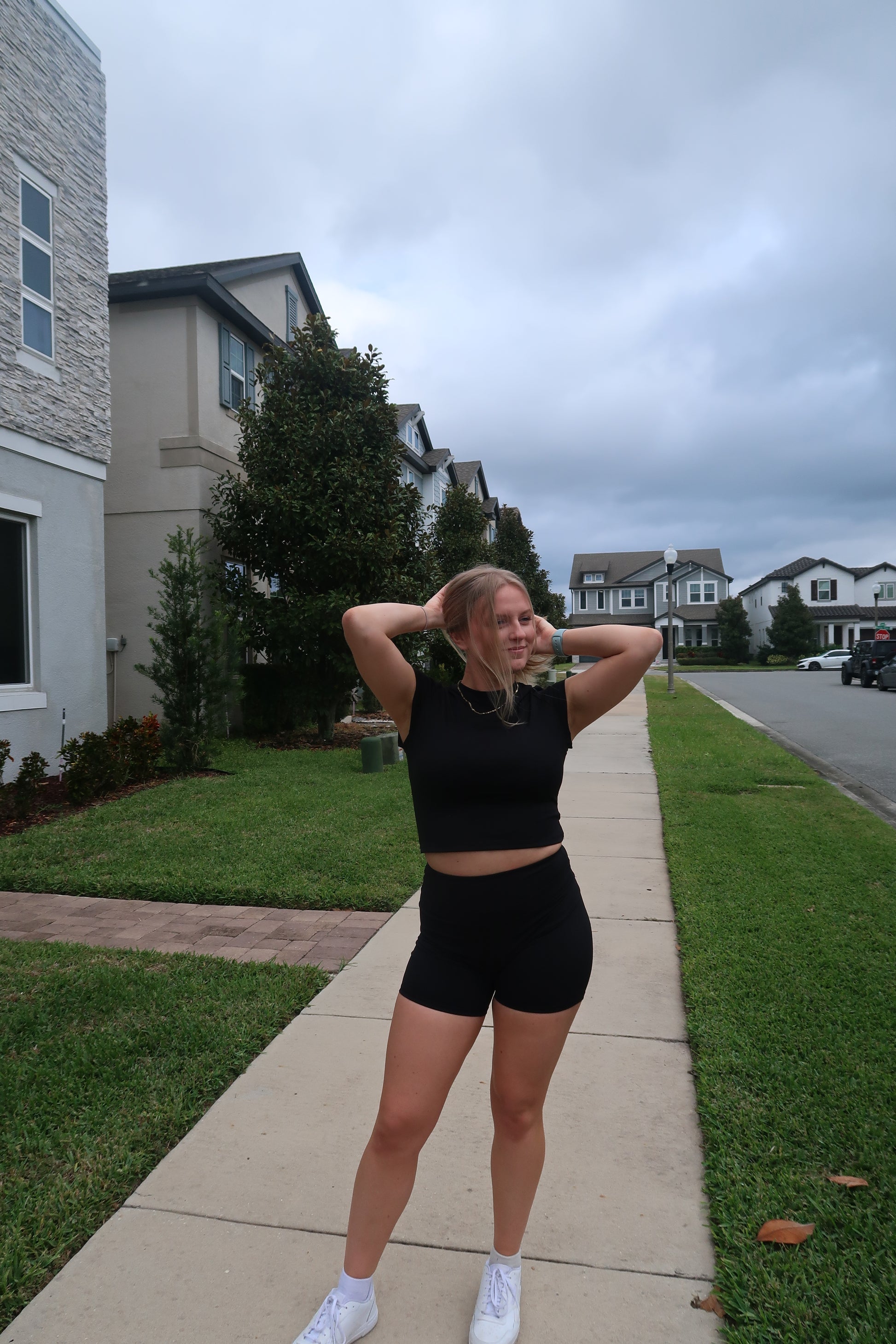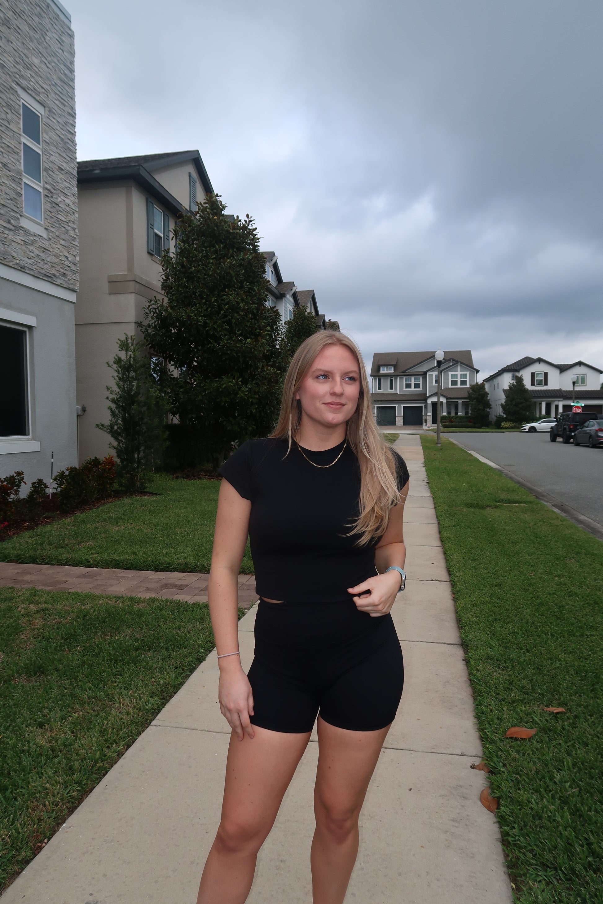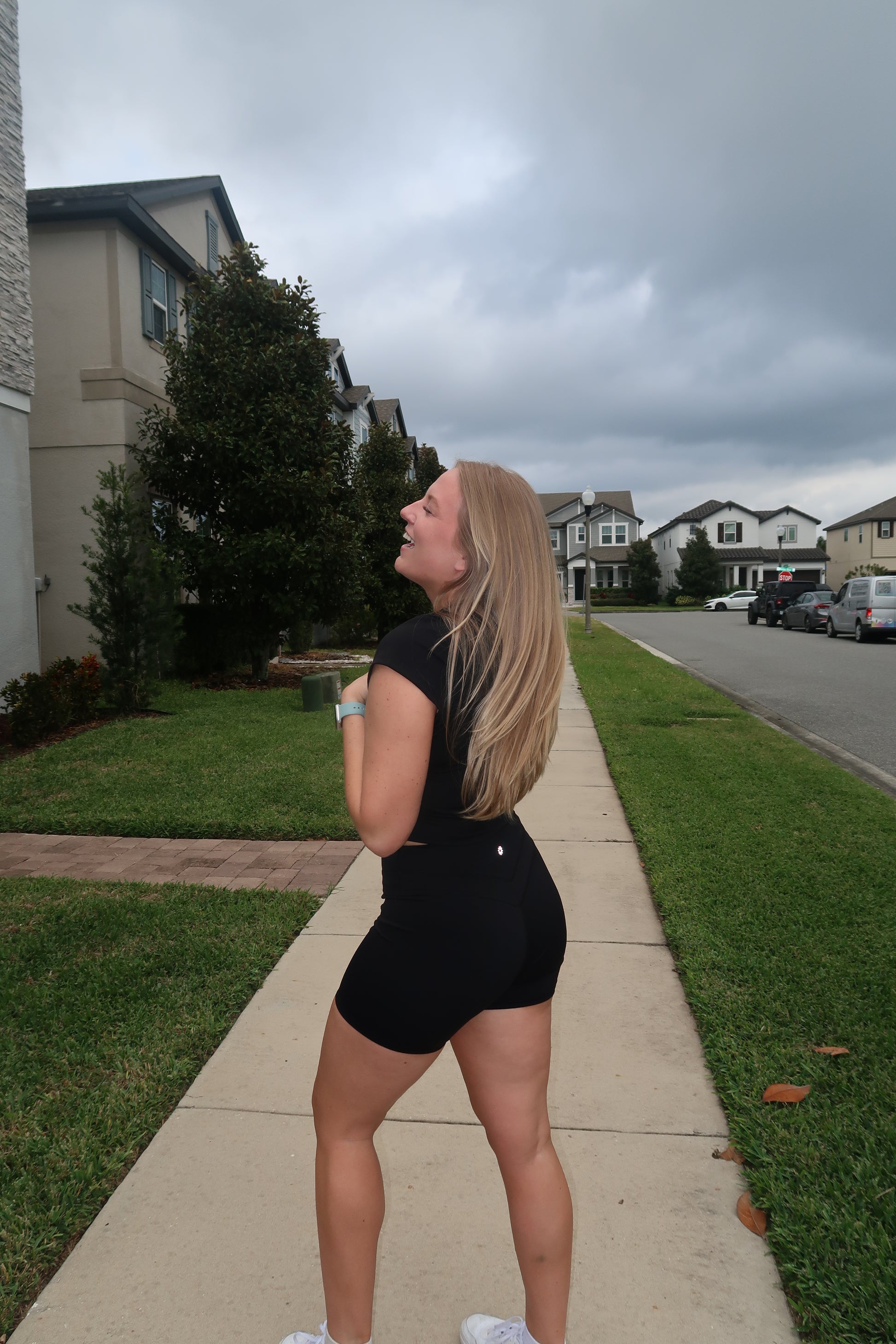 The BRI ACTIVE SHORTS: High-waisted, mid-length shorts designed to stay in place without rolling up. Ultra-comfy and supportive, they’re perfect for running, lifting, or cycling, offering a smooth, secure fit for every workout.