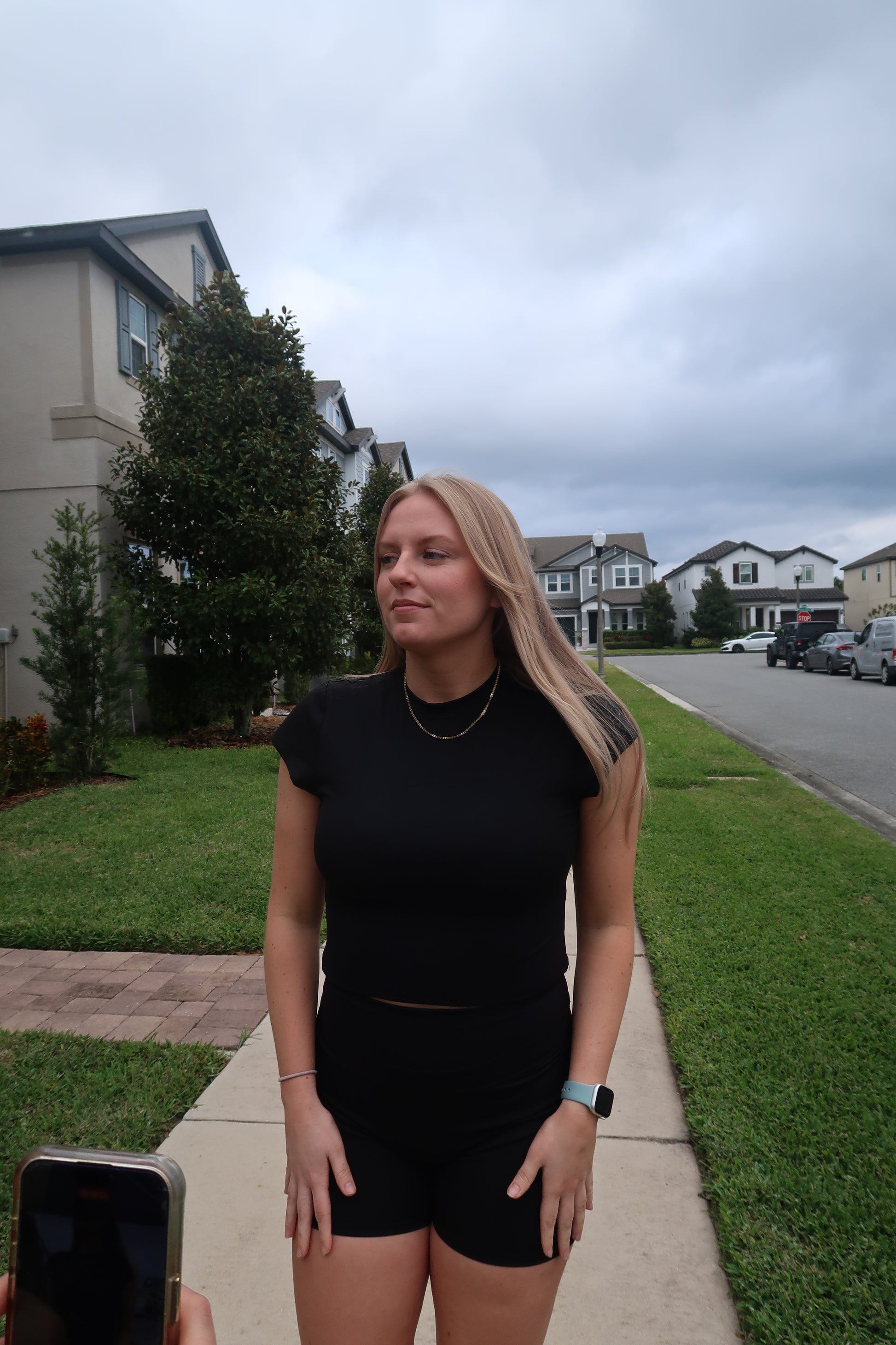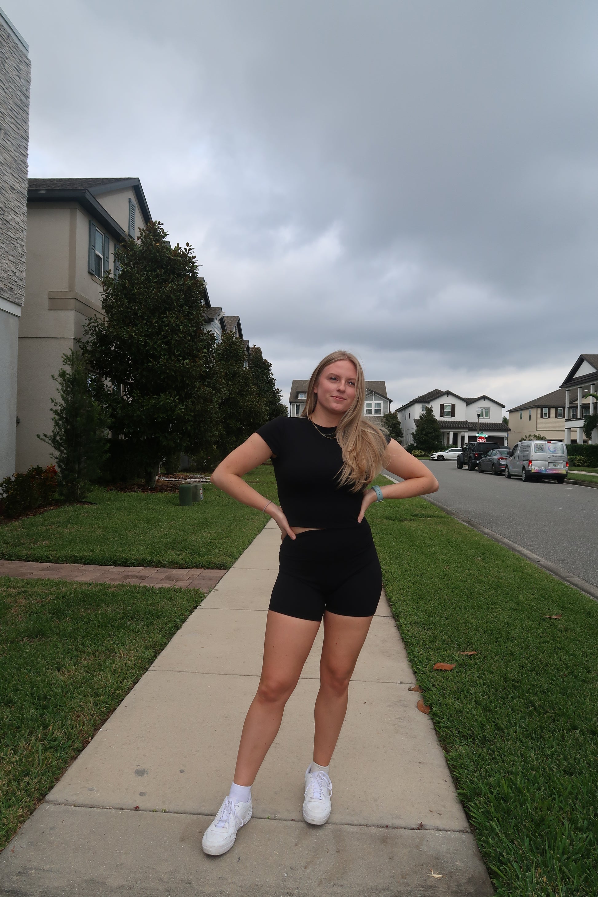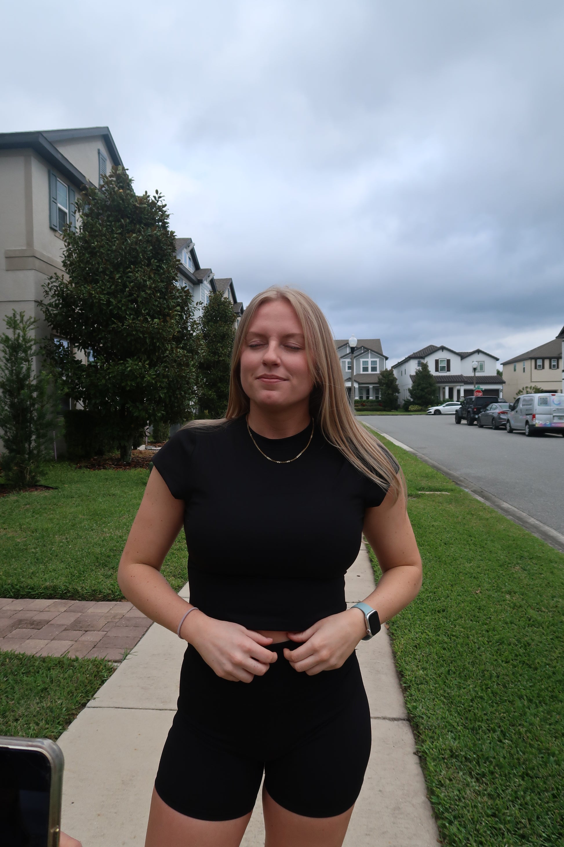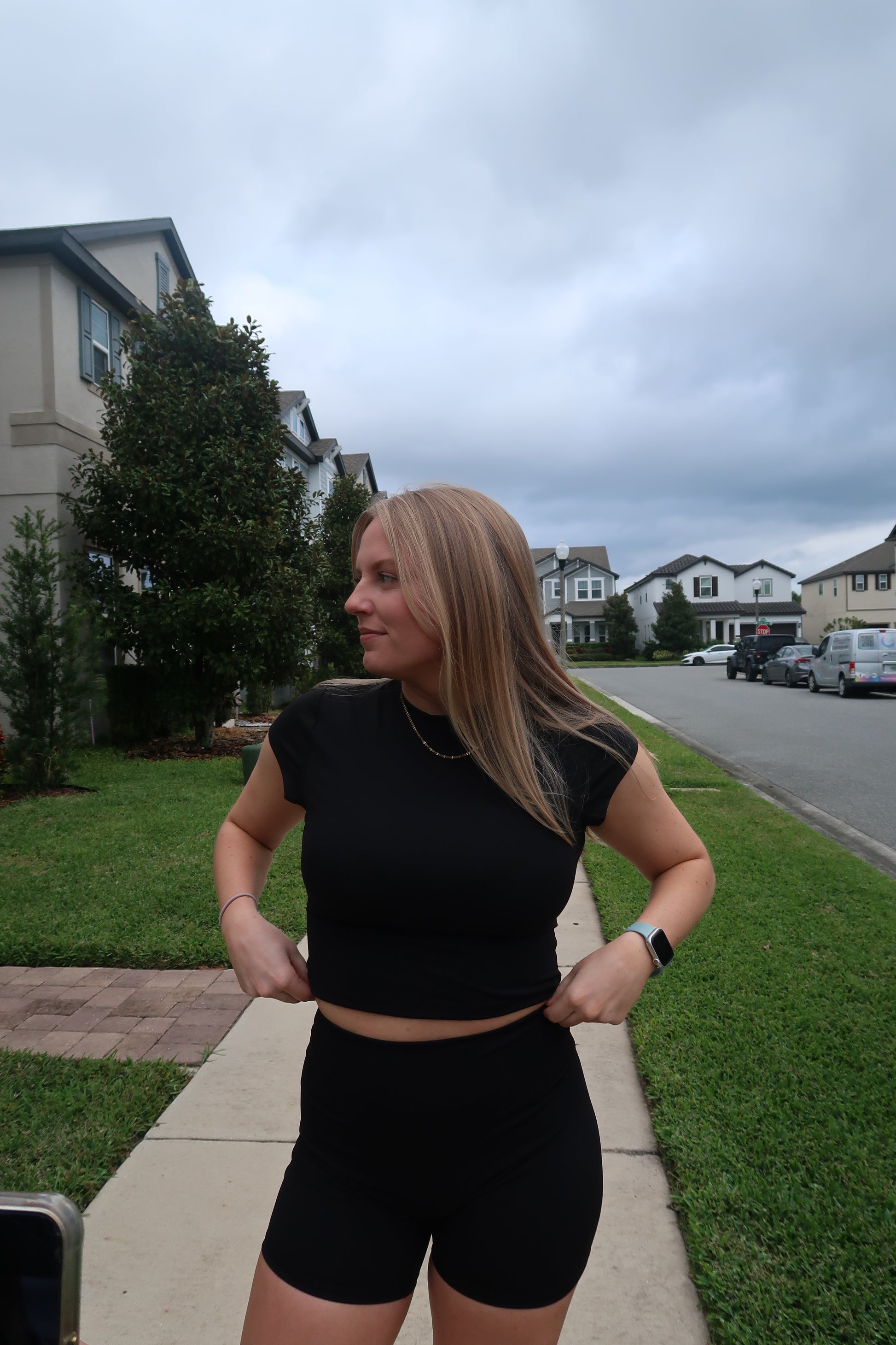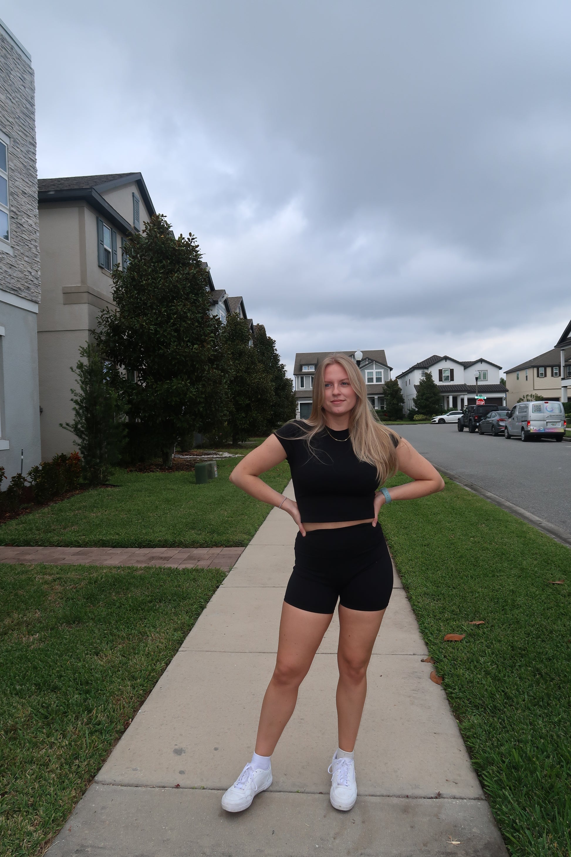 The BRI ACTIVE SHORTS: High-waisted, mid-length shorts designed to stay in place without rolling up. Ultra-comfy and supportive, they’re perfect for running, lifting, or cycling, offering a smooth, secure fit for every workout.