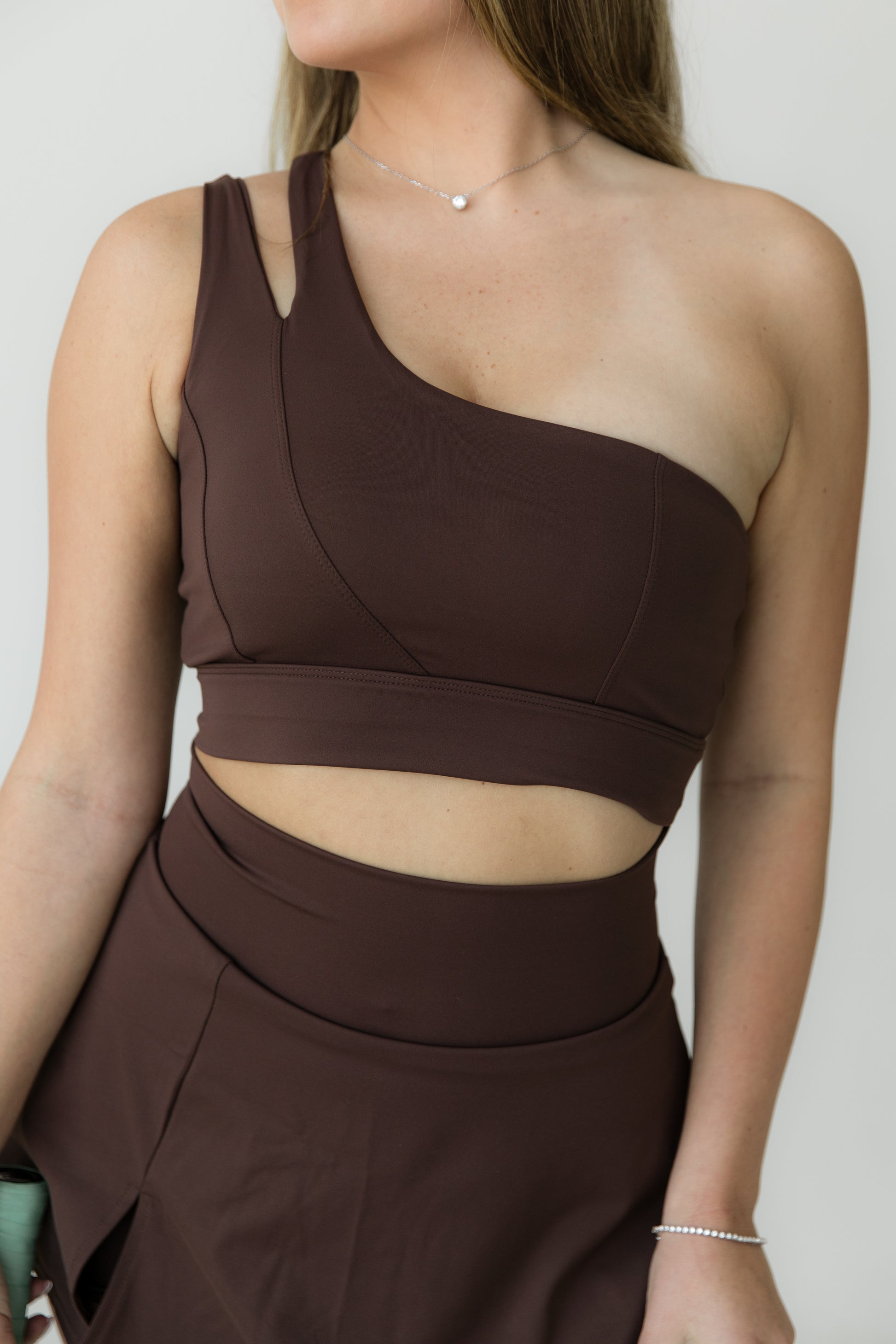 Crafted with precision, the Kayla Sports Bra boasts a unique one-shoulder design that sets you apart from the crowd. In a rich, earthy brown hue, it exudes sophistication and versatility, perfect for pairing with your favorite activewear bottoms.