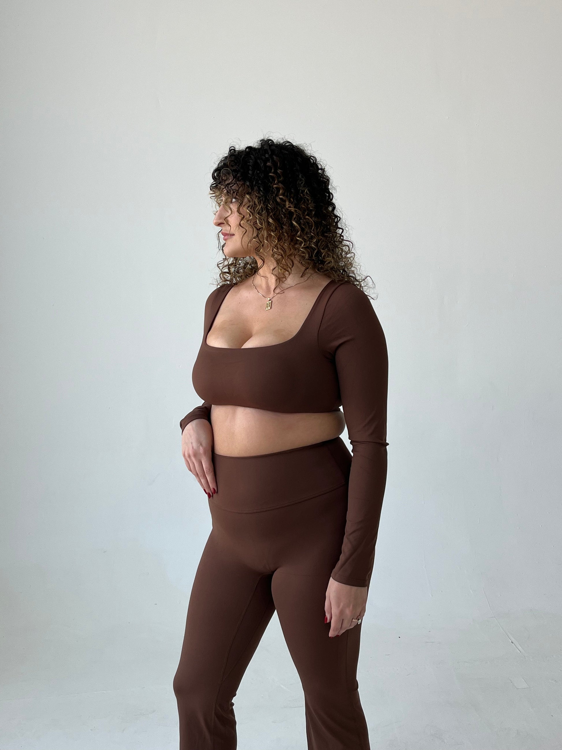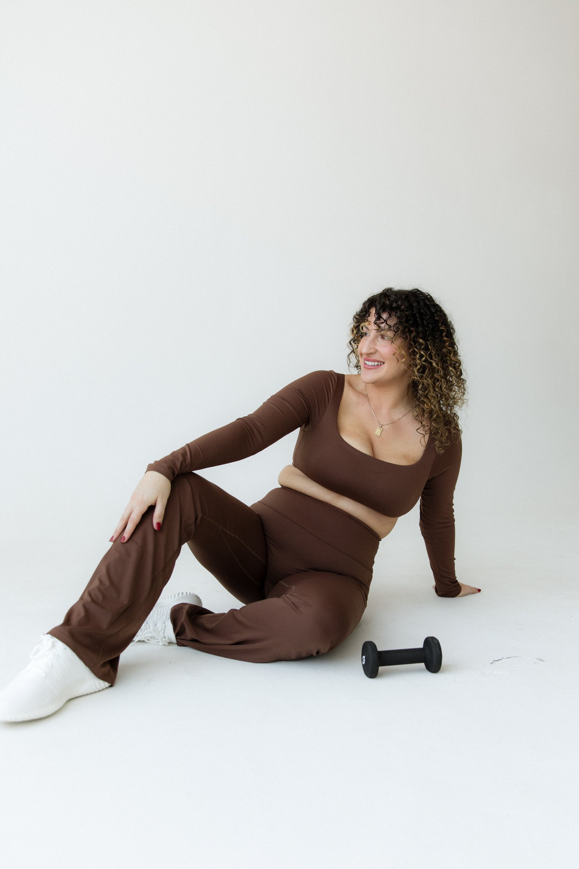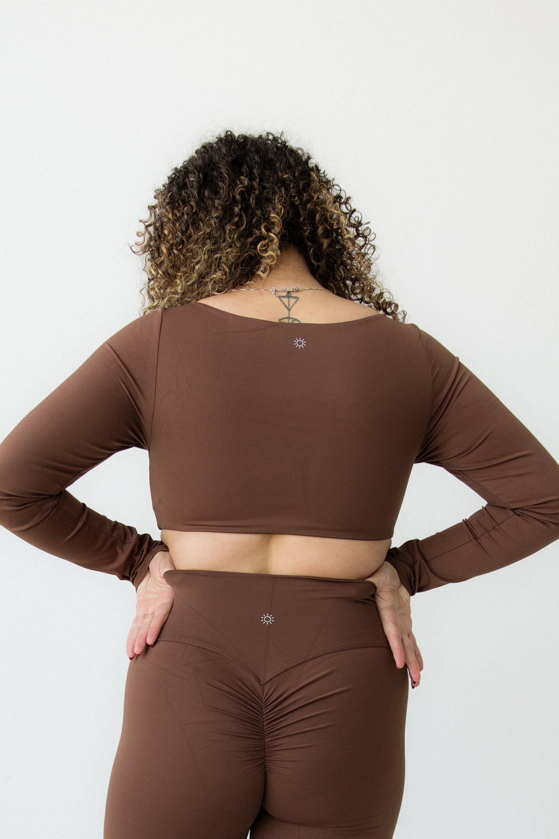 In a rich, earthy brown color, the Rocky Sports Bra adds a touch of sophistication to your gym ensemble. Its long sleeves offer extra coverage and protection, making it perfect for cooler weather workouts or as a stylish layering piece.