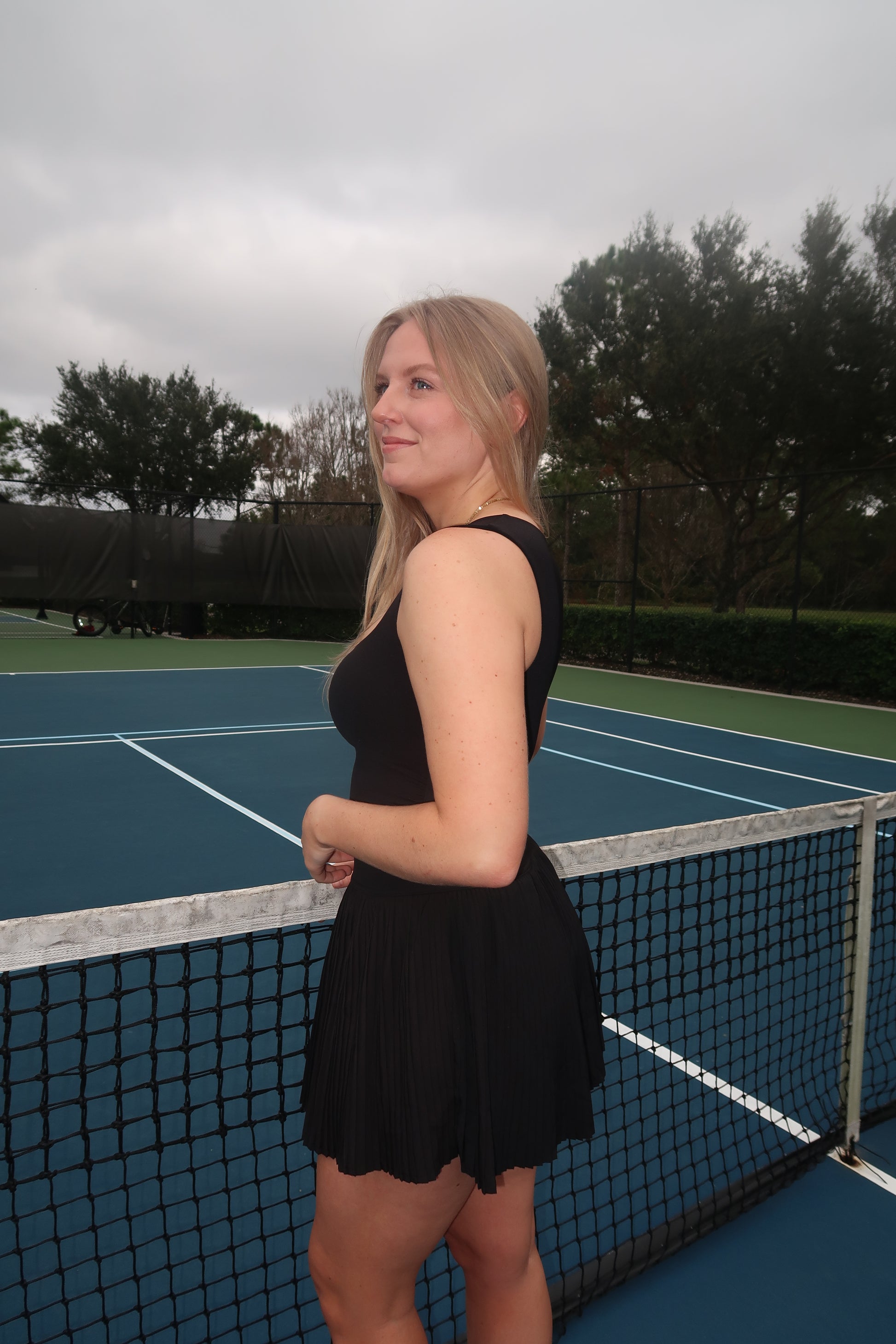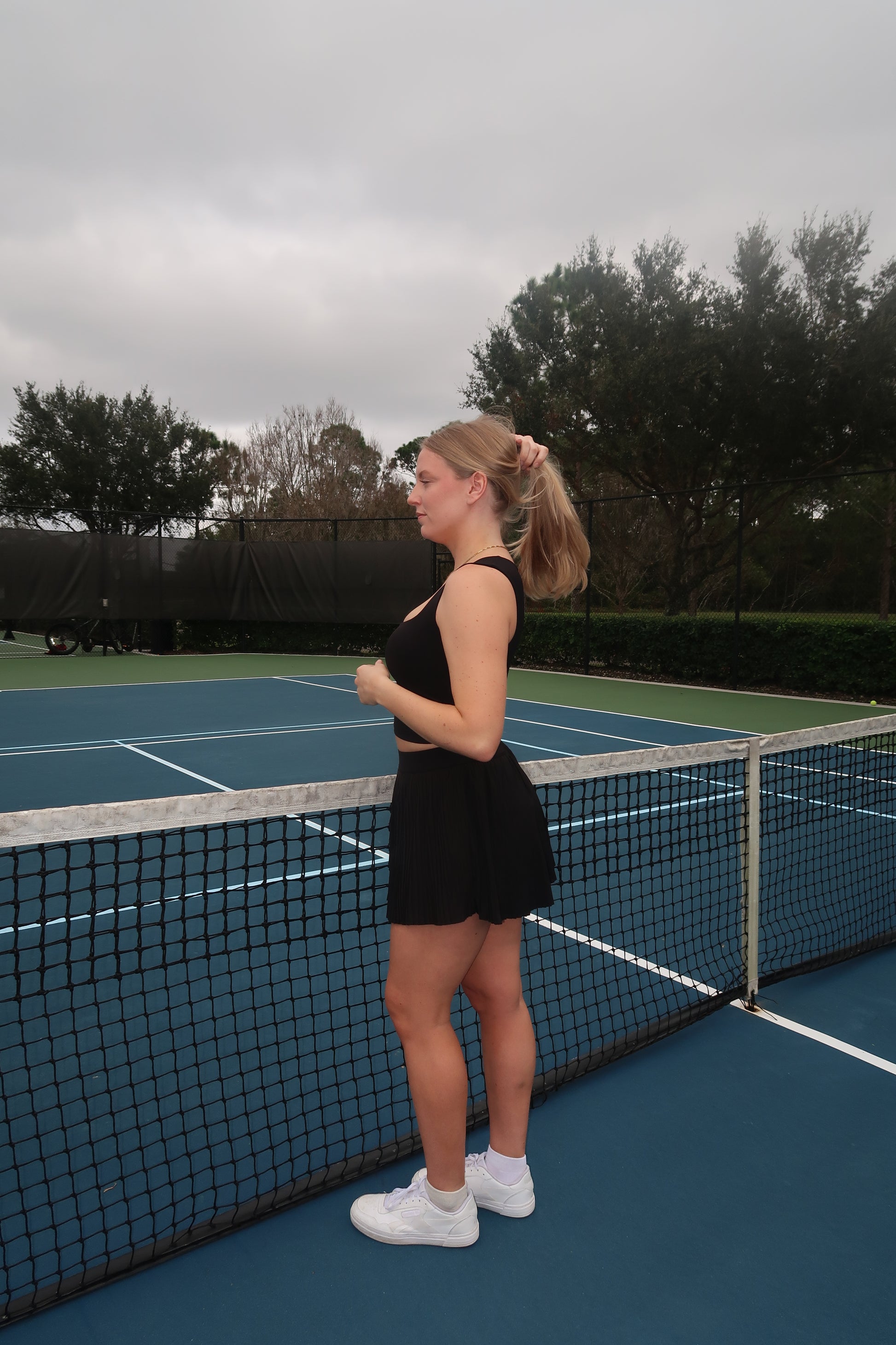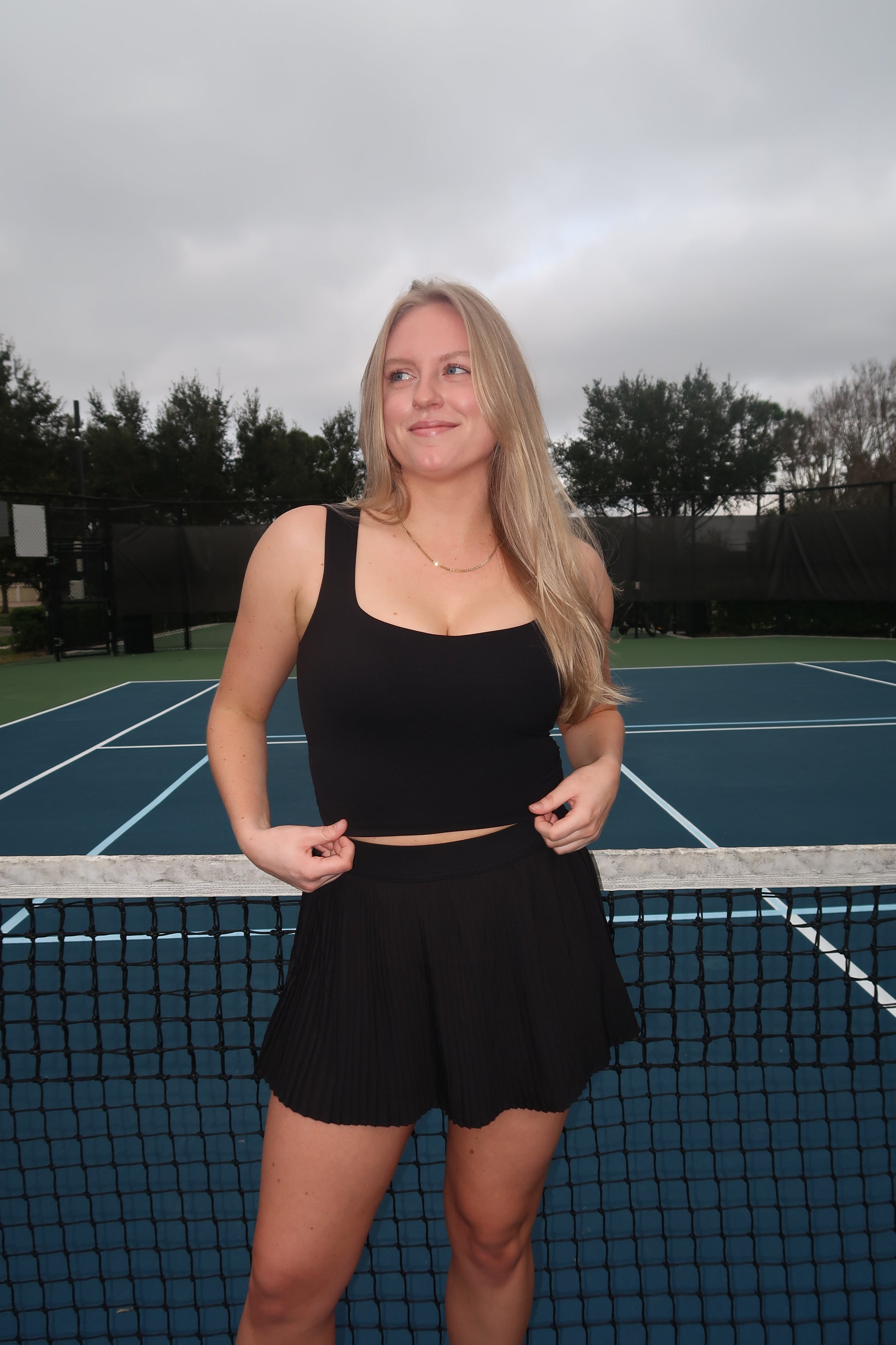 The Sam Active Top: A black cropped tank with a built-in bra, offering light support and all-day comfort. Perfect for tennis or any active pursuit, its sleek design keeps you stylish on and off the court.